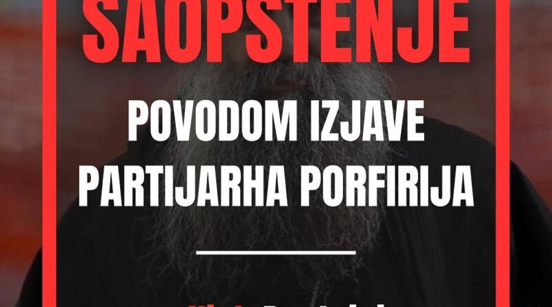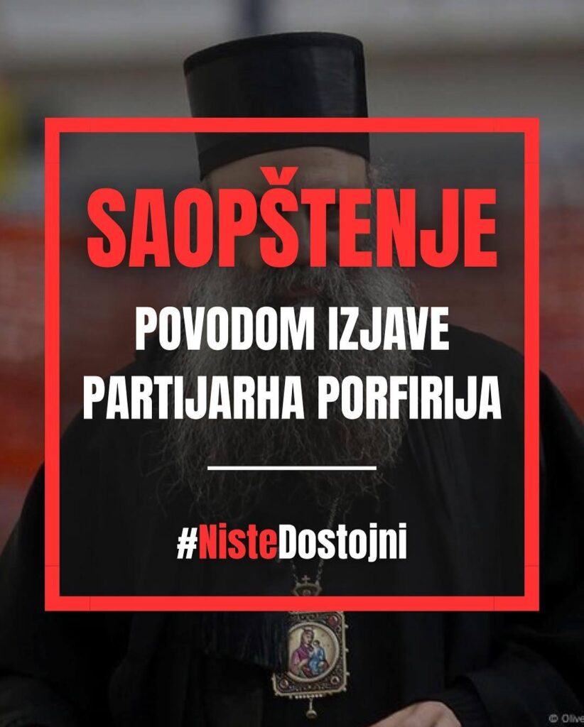 Изражавамо дубоко разочарање, тугу и гнев поводом сусрета патријарха Порфирија са председником Русије, Владимиром Путином, као и изјава које је том приликом дао. Патријарх је рекао да се у Србији „спречава обојена револуција“ и тиме стао раме уз раме са онима који нашу борбу , борбу младих људи за достојанство, правду и слободу, називају државним ударом.