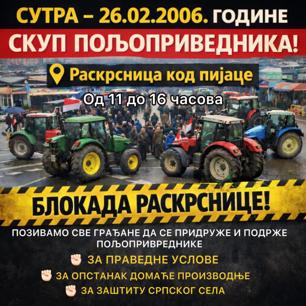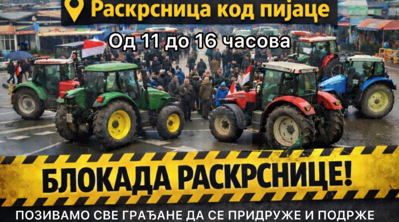 Пољопривредници најавили блокаду раскрснице код Зелене пијаце 26. фебруара од 11 до 16 сати
