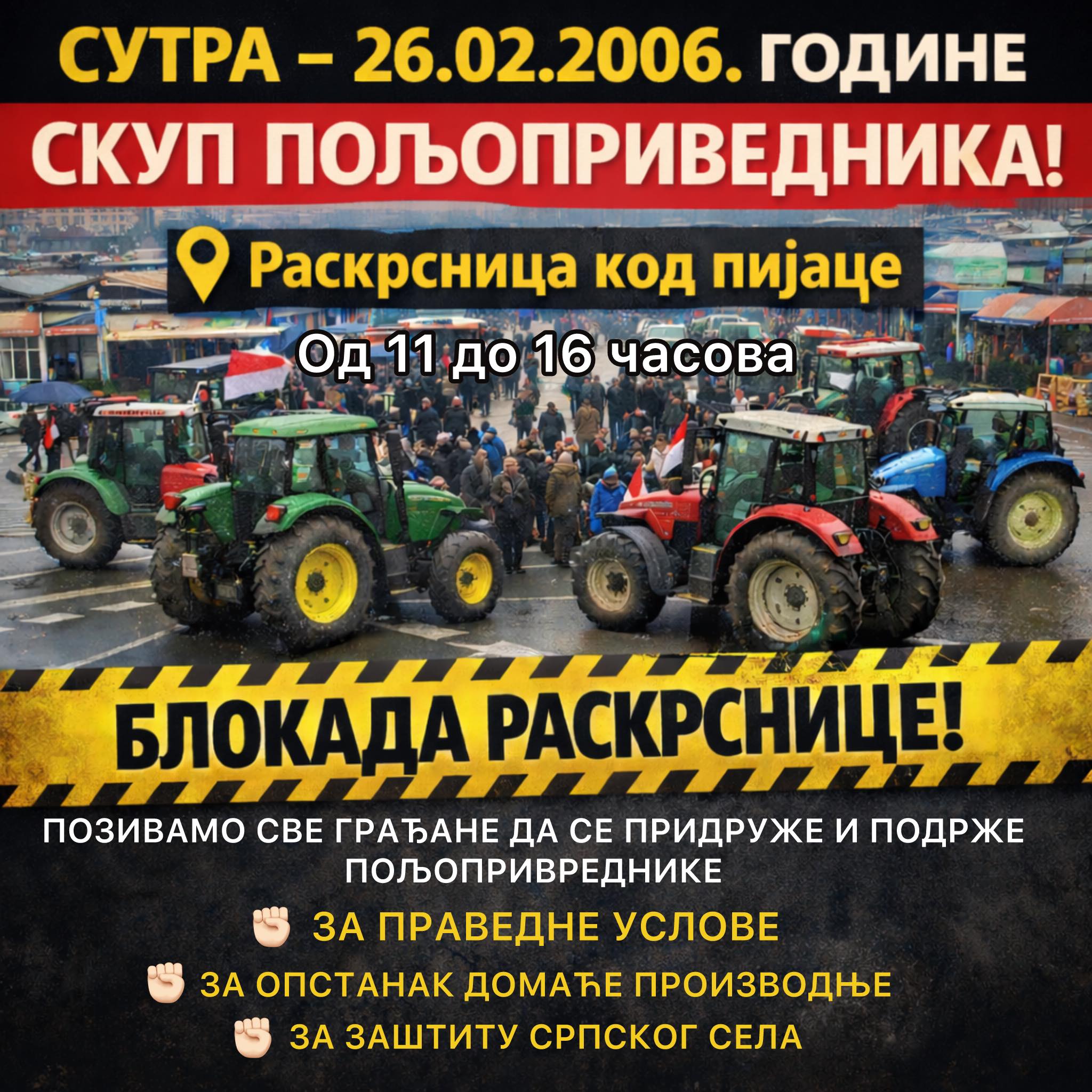 Пољопривредници настављају са блокадама саобраћајница у Смедеревској Паланци са циљем остваривања праведнијих услова на тржишту пољопривредних производа, и за опстанак српског села, и позивају суграђане да им се придруже.