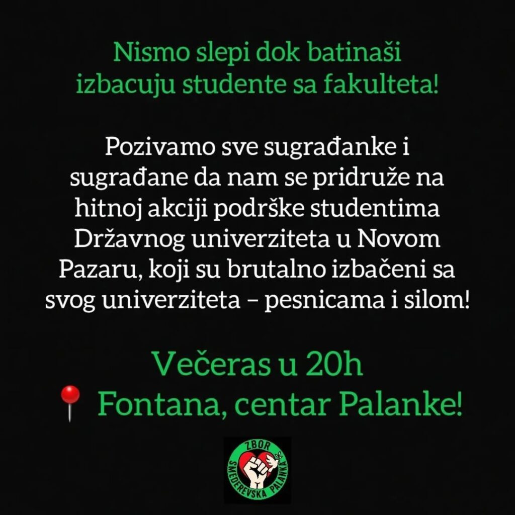 Просветни радници Смедеревске Паланке саопштили су да дају подршку студентима државног универзитета у Новом Пазару које су батинаши избацили са факултета.