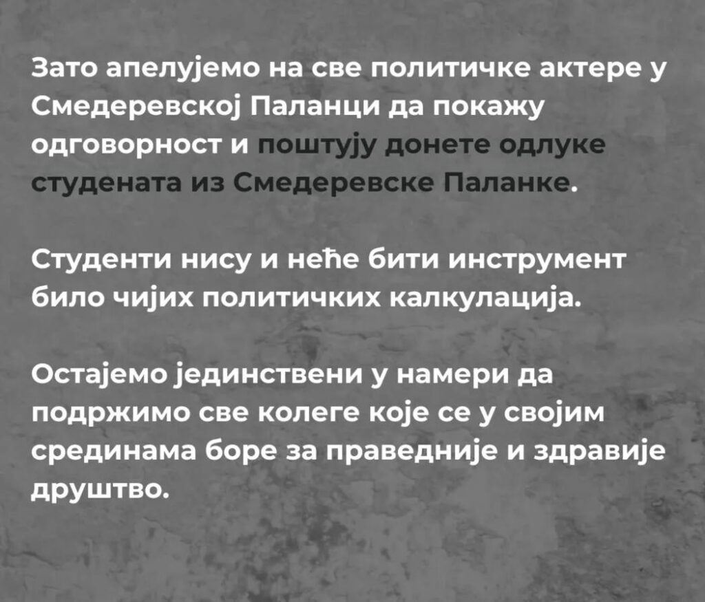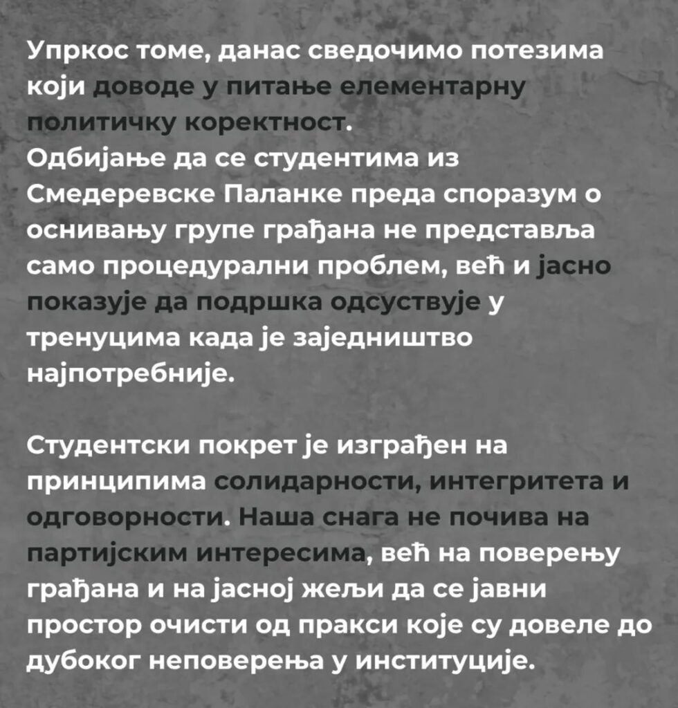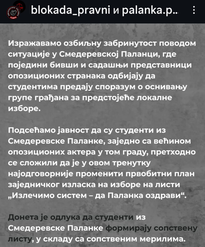 Поводом ситуације у Смедеревској Паланци, настале након откривања покушаја преваре и злоупотребе студентске листе огласили су се Студенти у блокади, чије саопштење преносимо: